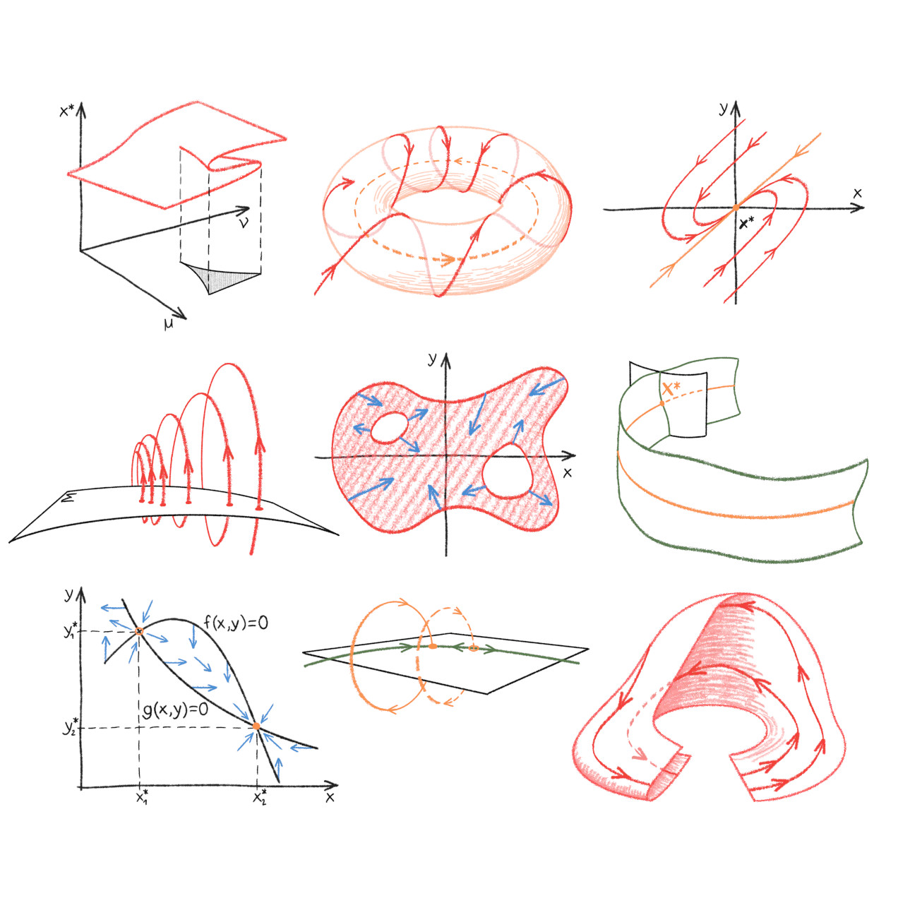 Nonlinear Dynamics Textbook, De Gruyter, 2023 Illustrations for the Nonlinear Dynamics textbook by Axelle Amon and Marc Lefranc, de Gruyter 2023. Digital drawing.
