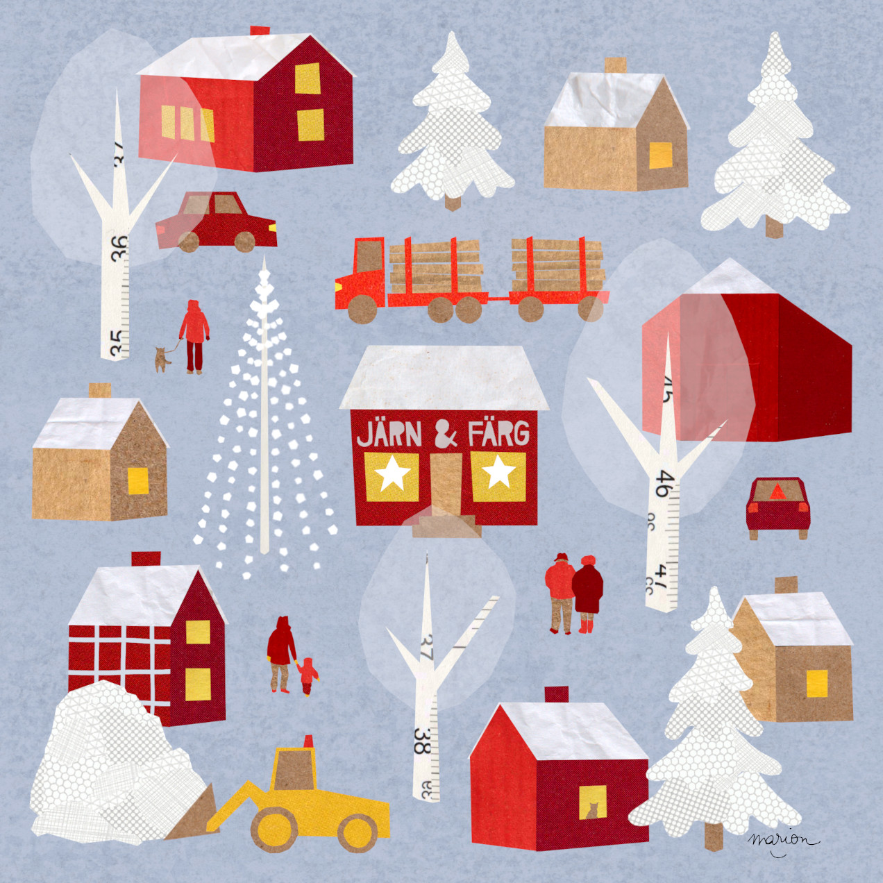 Västerbotten Winter Village – cut paper and digital illustration using old envelopes, tissue paper, various reclaimed paper and hand painted gouache textures. – 2022